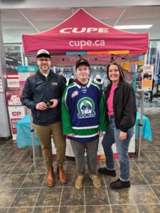 CUPE Saskatchewan President Kent Peterson and CUPE 183 Vice-President Emilie Poh brought energy to the ice, launching T-shirts into the stands with a T-shirt cannon. Peterson also had the honours of dropping the ceremonial puck and drawing the lucky winner of the signed jersey.