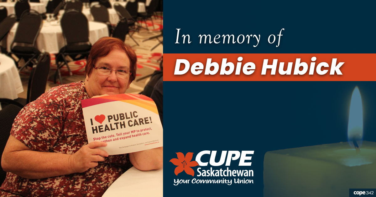 We remember Debbie Hubick. CUPE Saskatchewan President Kent Peterson issued the following statement paying tribute to the life and legacy of Debbie Hubick: