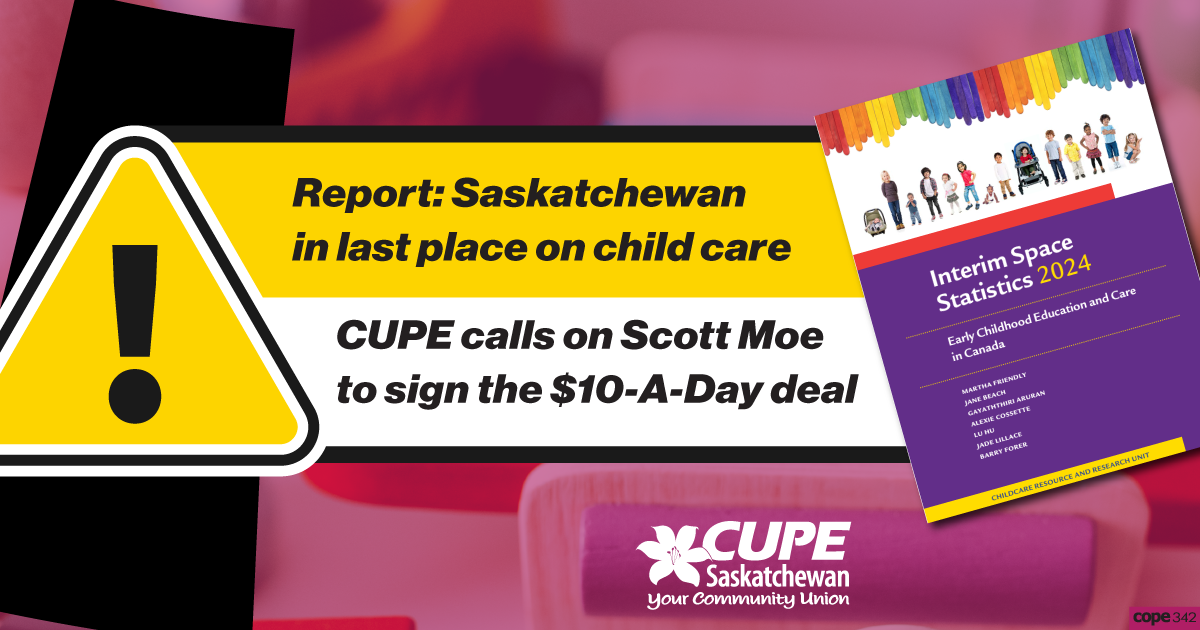 CUPE Saskatchewan calls on Scott Moe and the Sask. Party to renew the $10-a-day child care agreement with the federal government, as the province has the worst availability of child care spaces in the country.