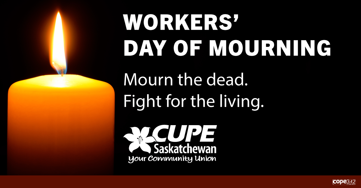 On April 28, we gather to mourn workers who have been killed, injured, or made ill because of workplace hazards or incidents – and recognize the lasting impact on their families and communities. Attend vigils on April 28 in Regina (City Hall at 5:30 p.m.), Moose Jaw (Union Centre at 6:00 p.m.), Saskatoon (Civic Square at 6:00 p.m.), and Weyburn (T.C. Douglas Calvary Centre at 5:30 p.m.).